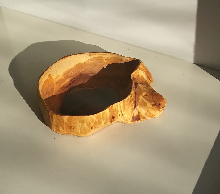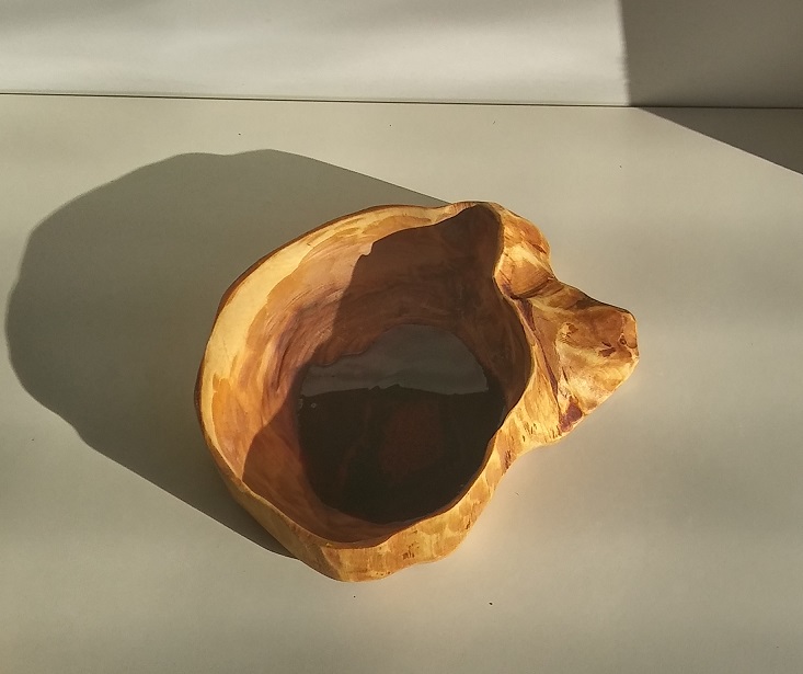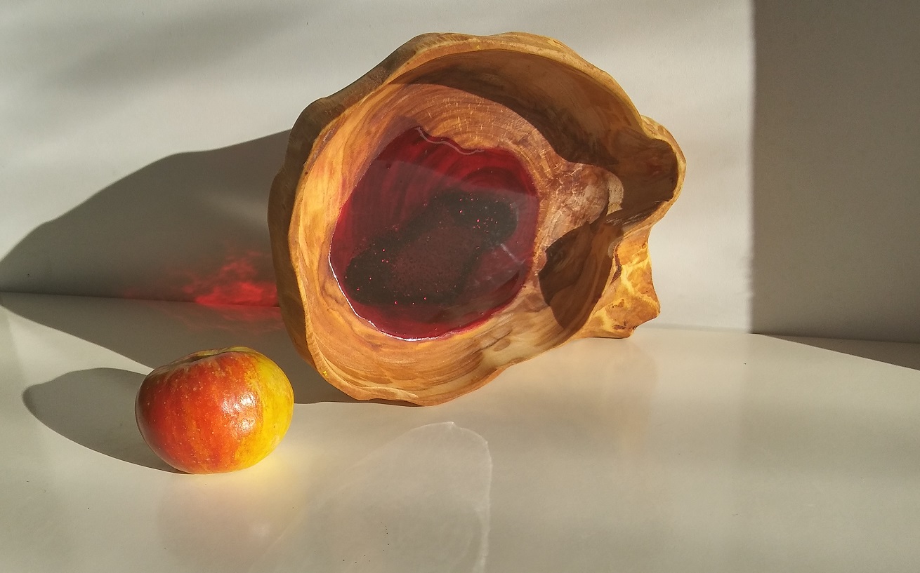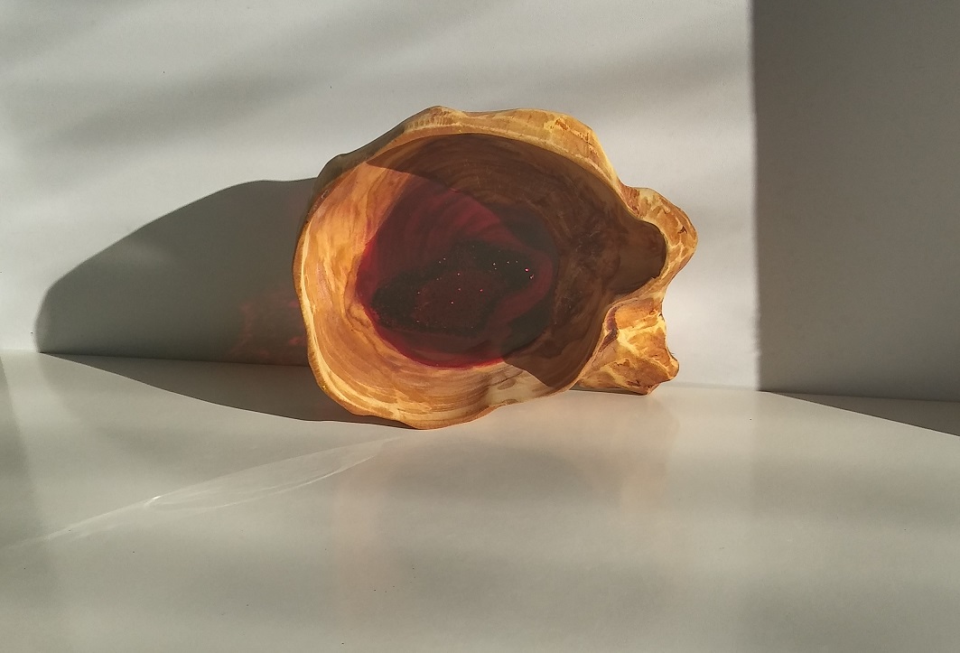 Unikatna lesena dekorativna posoda z rdečo epoxy smolo in bleščicami.