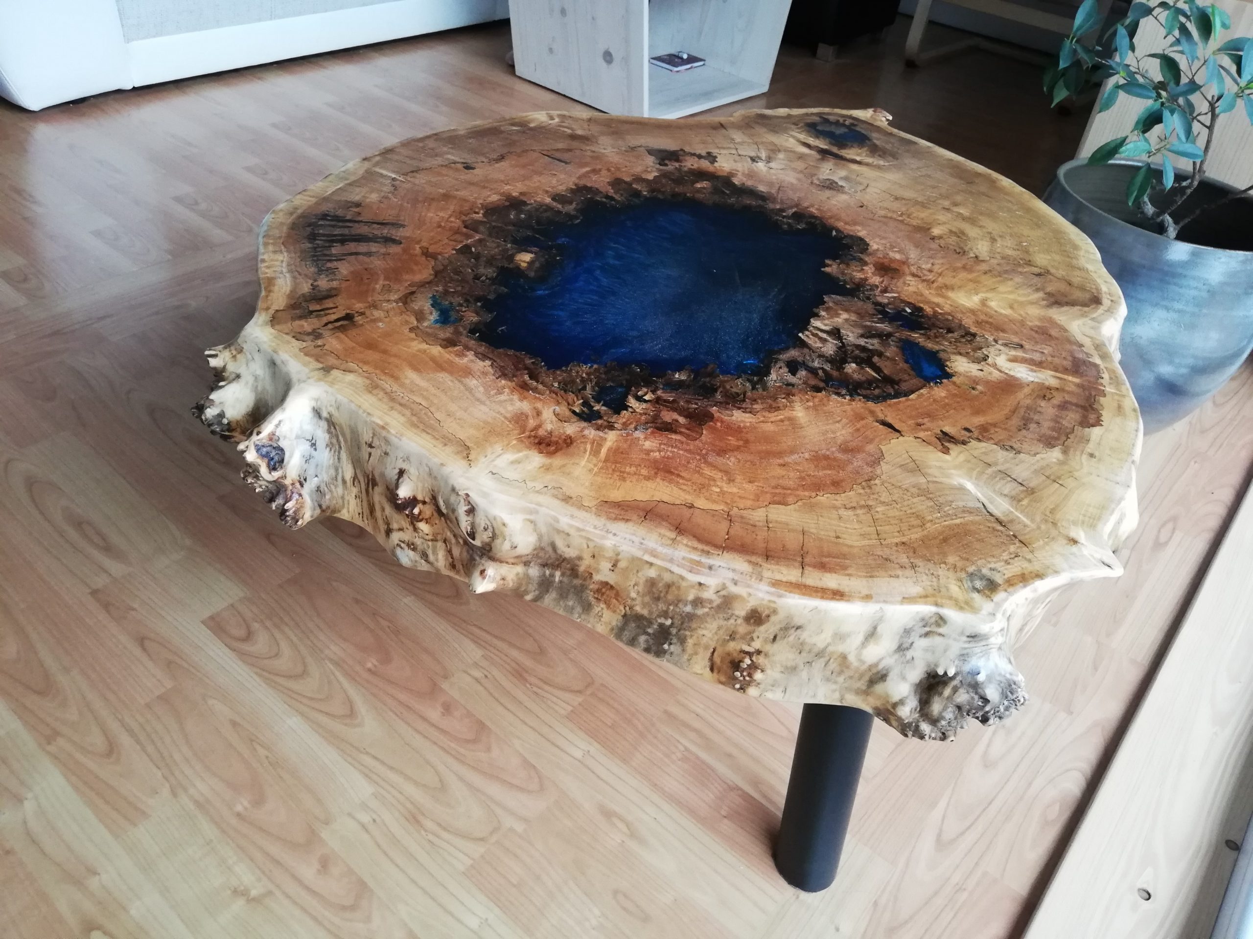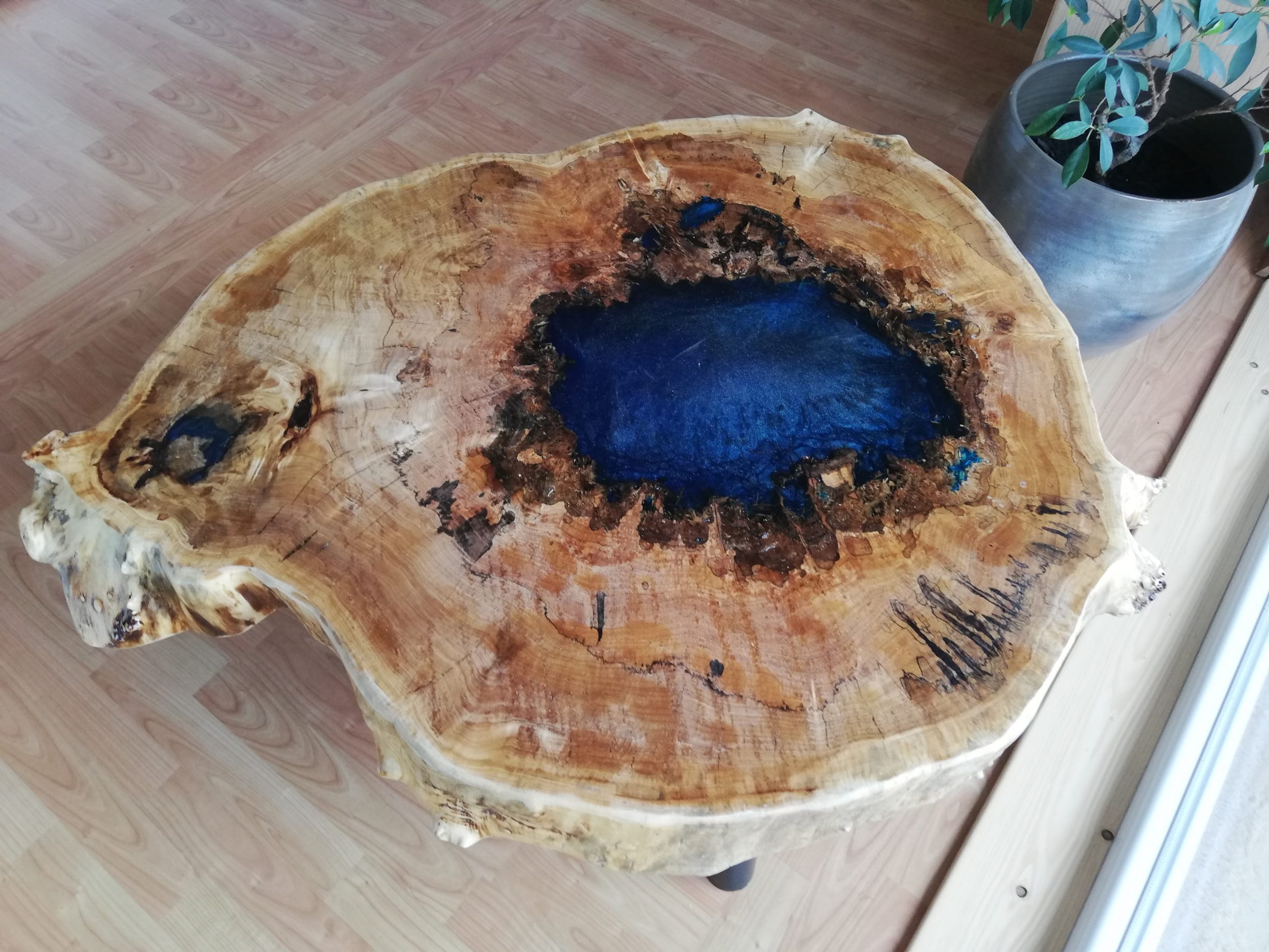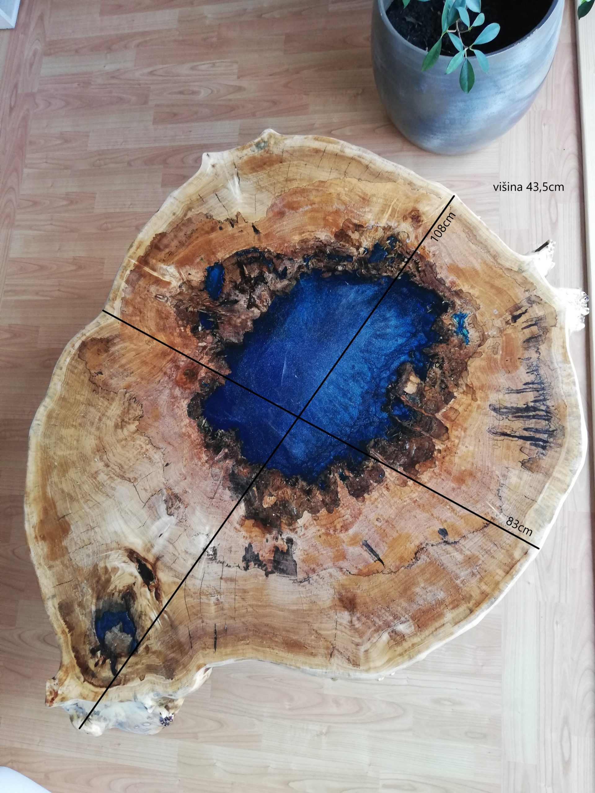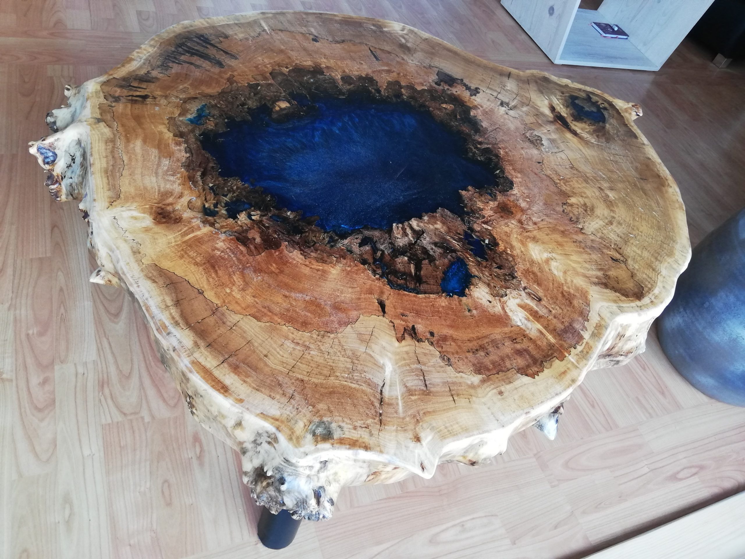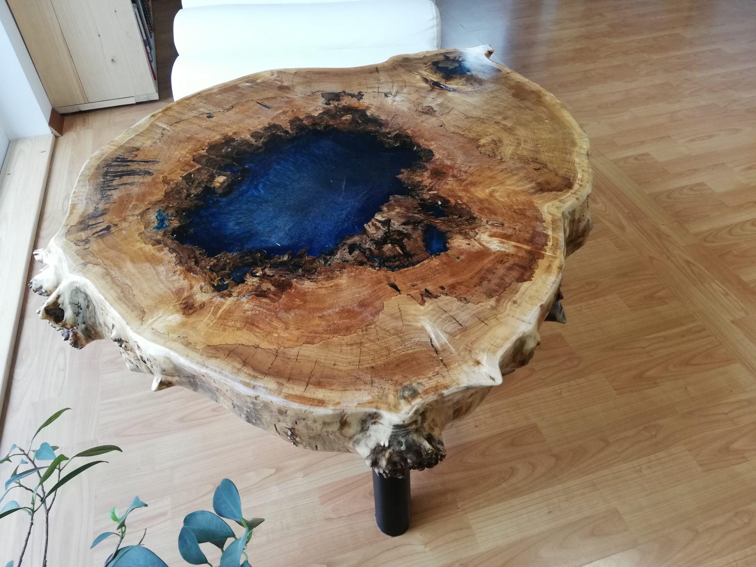 Kavna miza z modro epoksi smolo v sredini in črnim mat podstavkom iz železa.