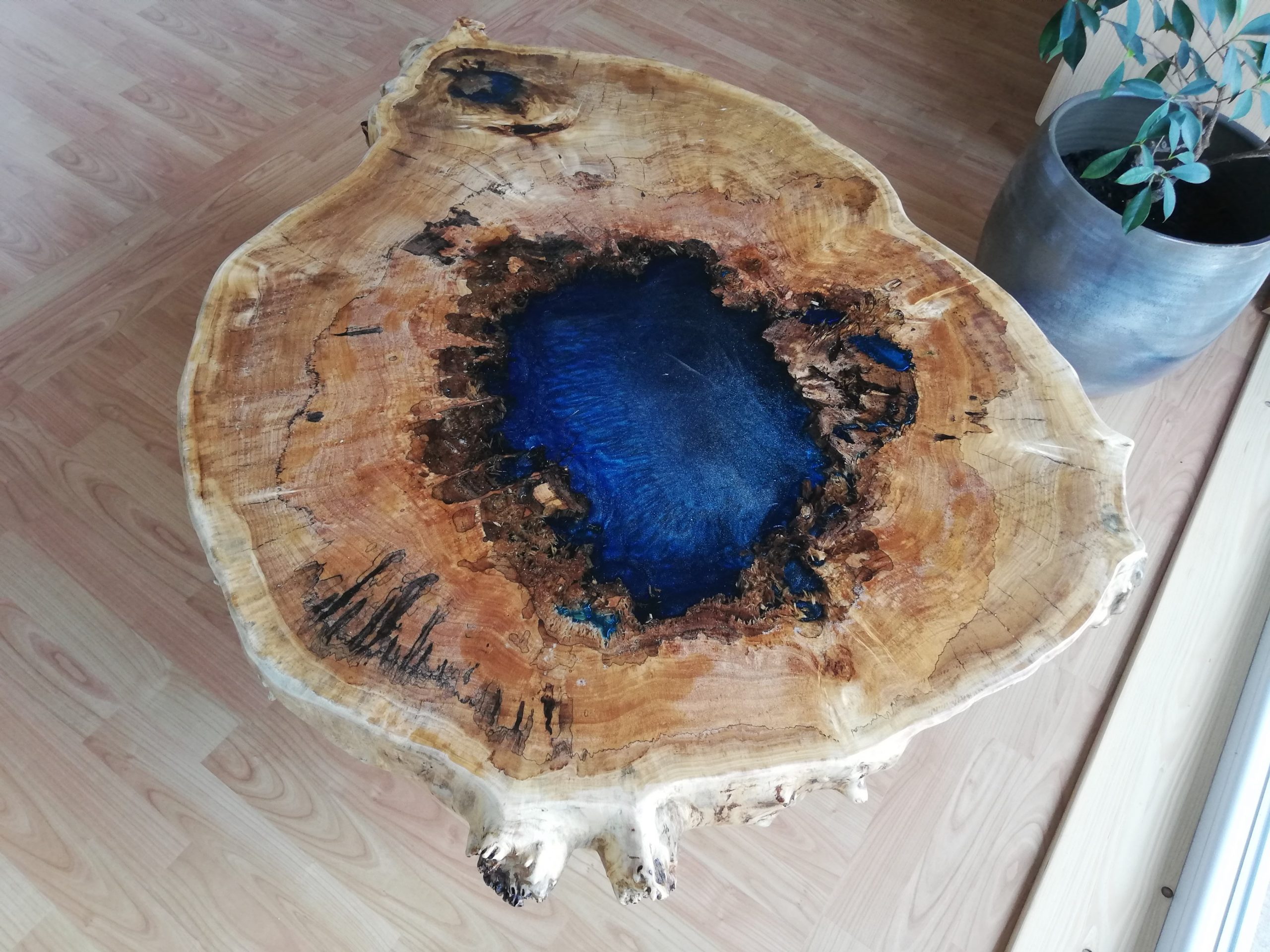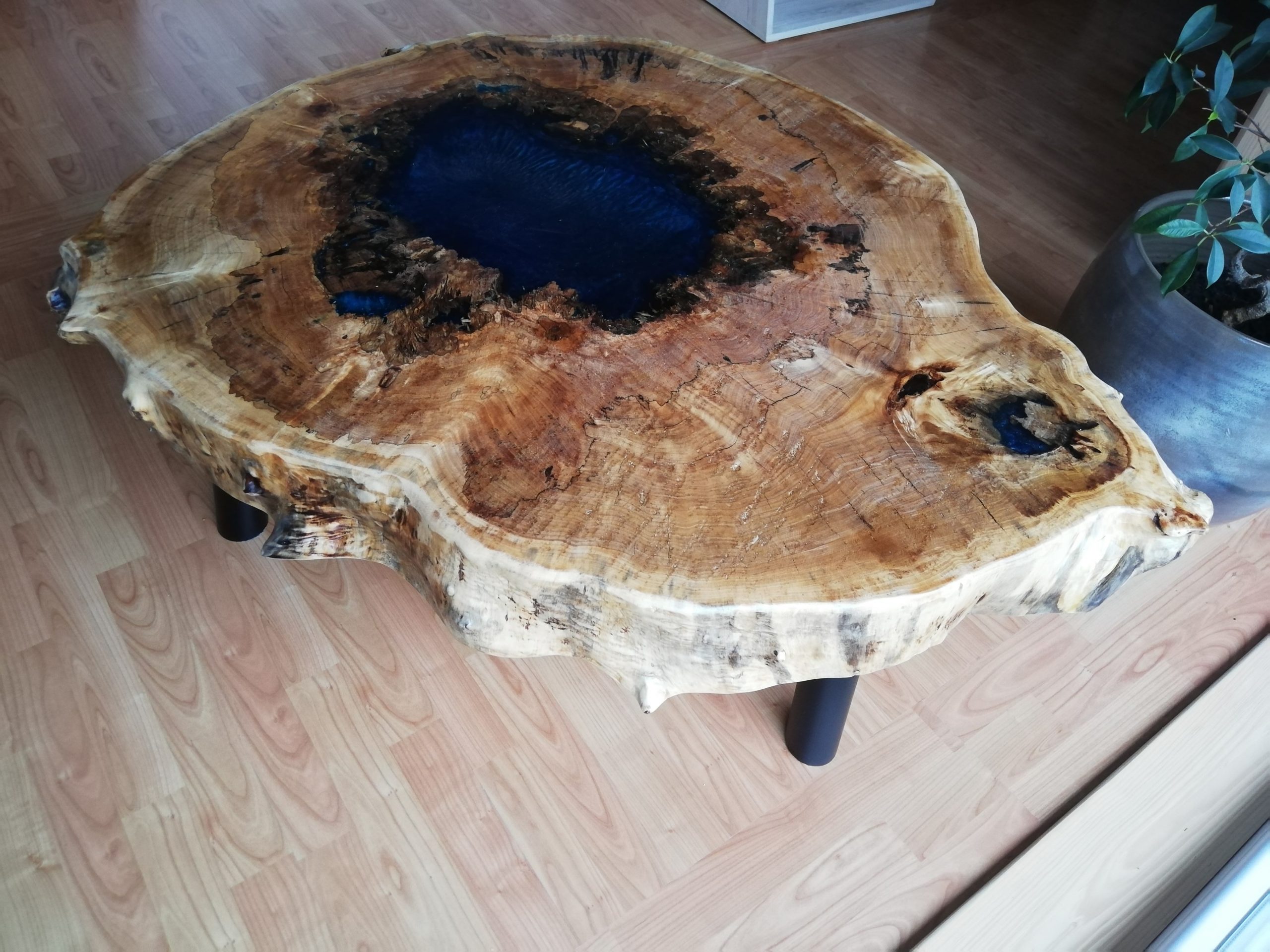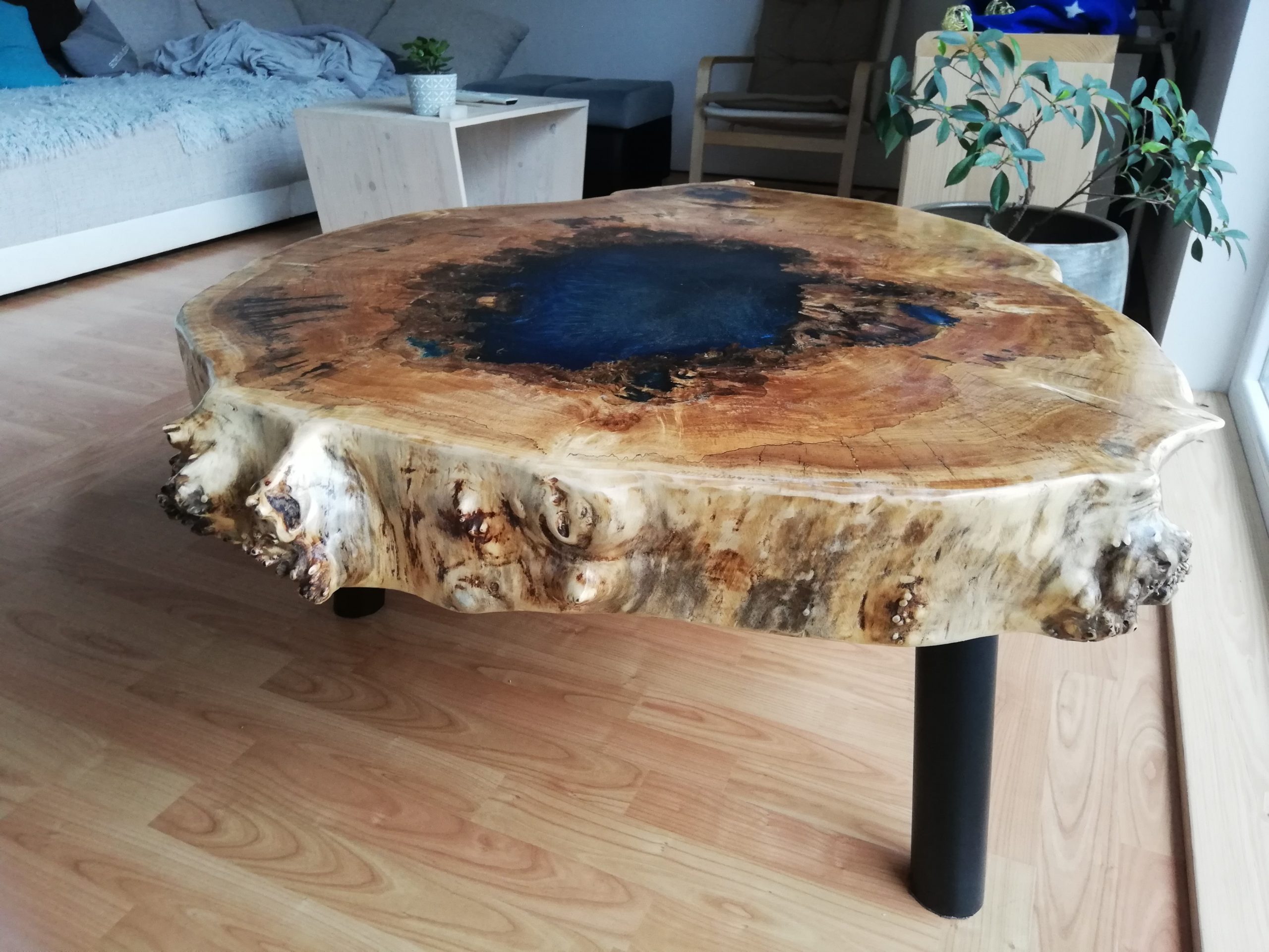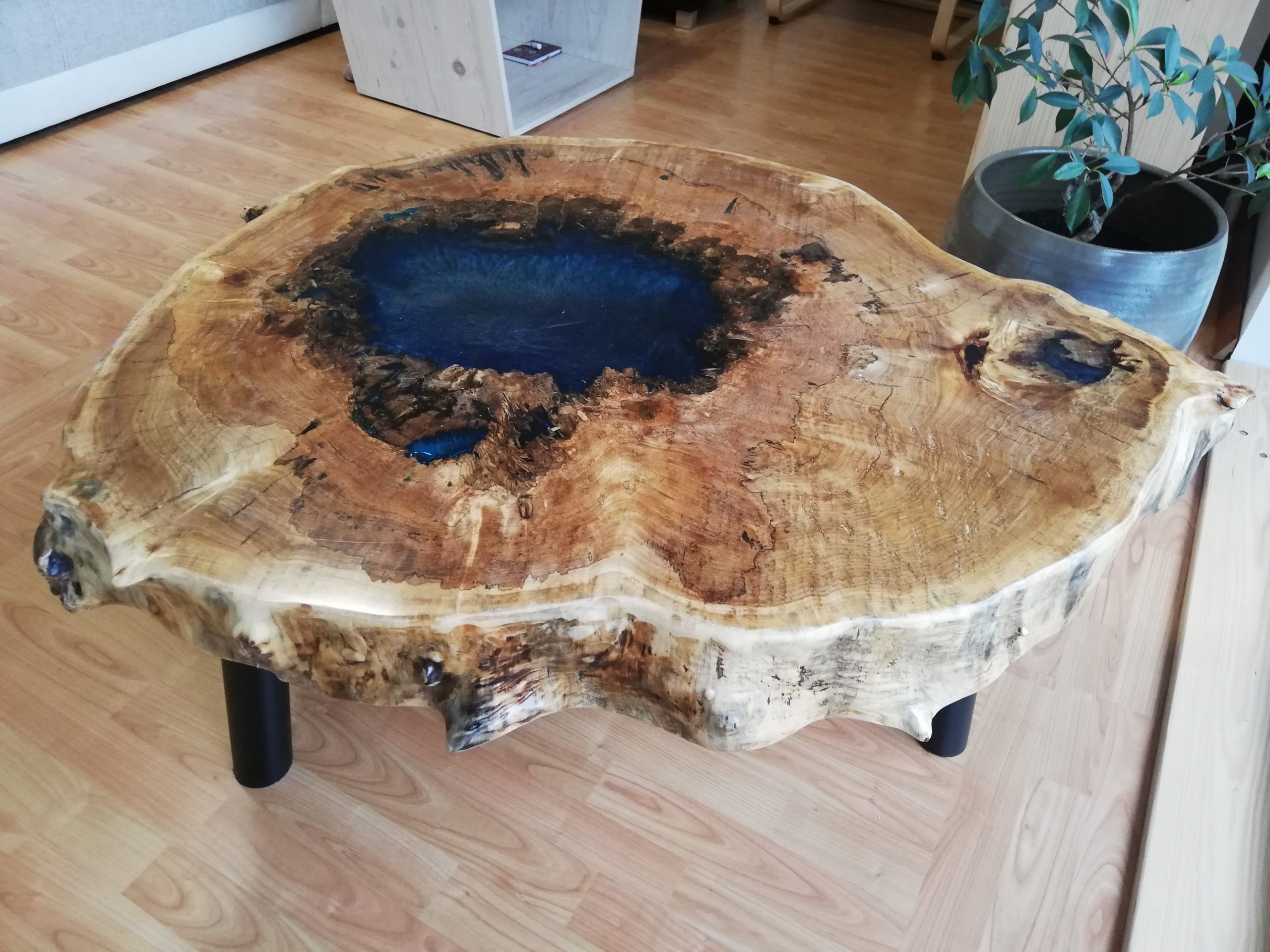 Kavna miza z modro epoksi smolo v sredini in črnim mat podstavkom iz železa.