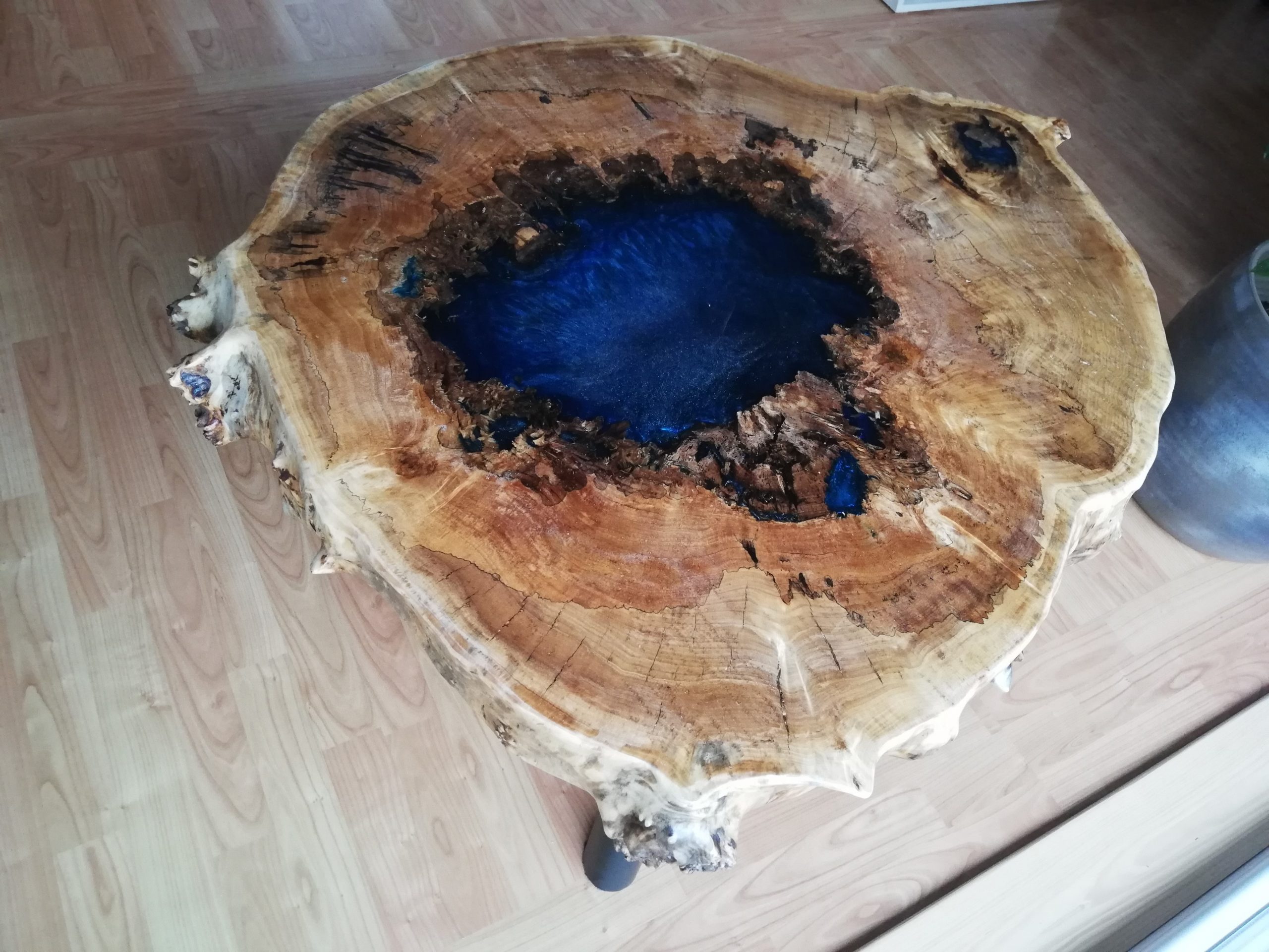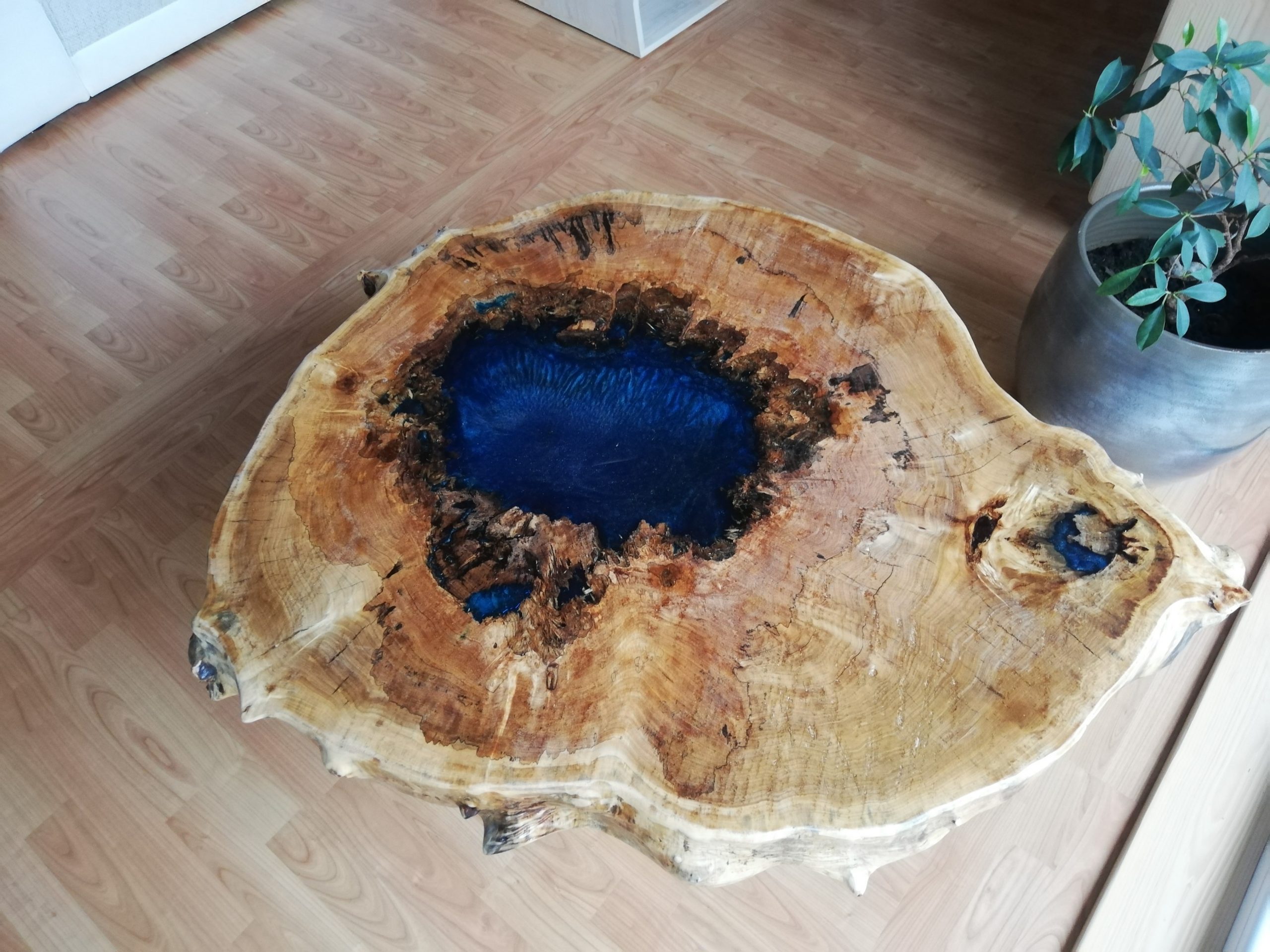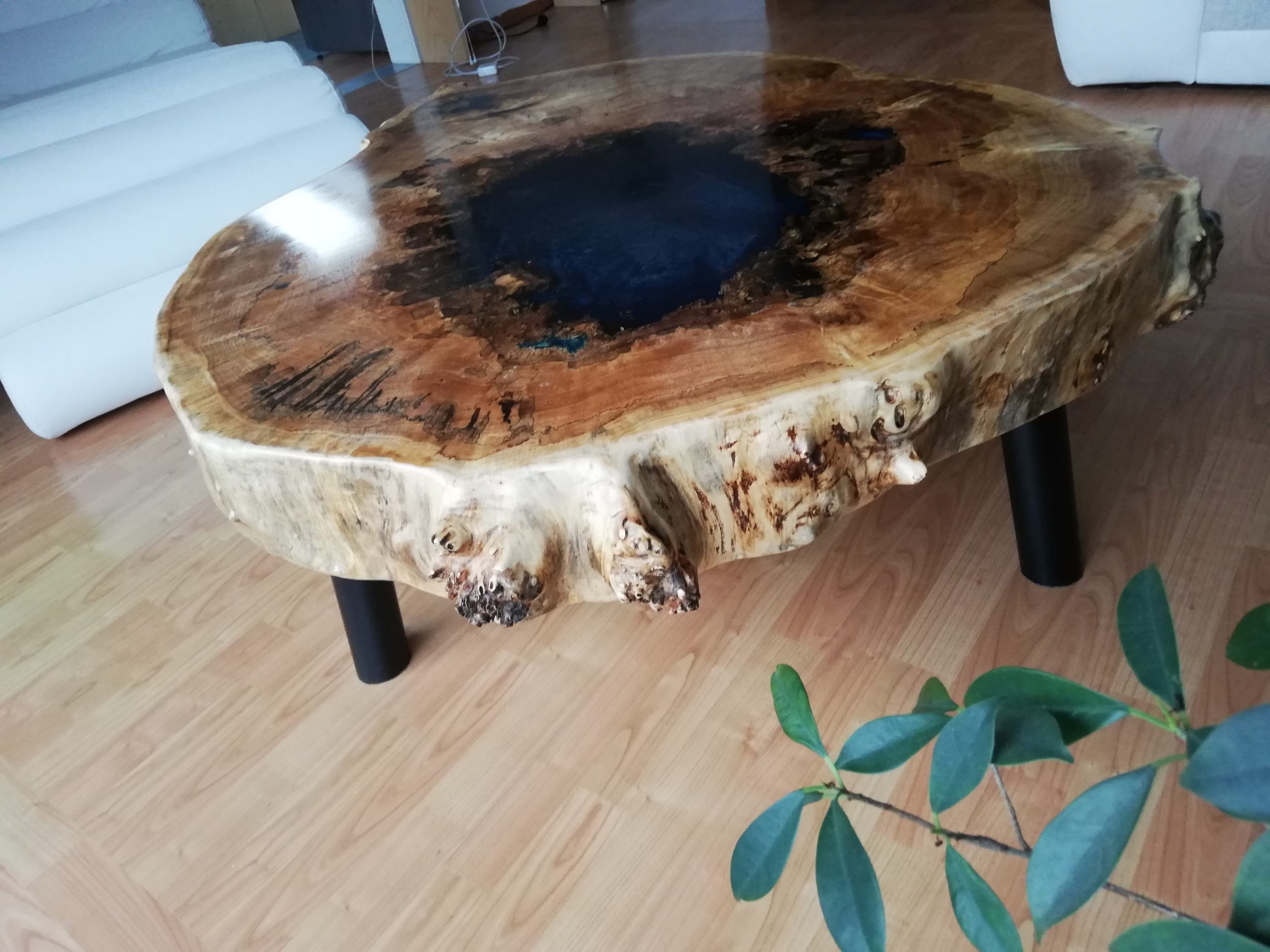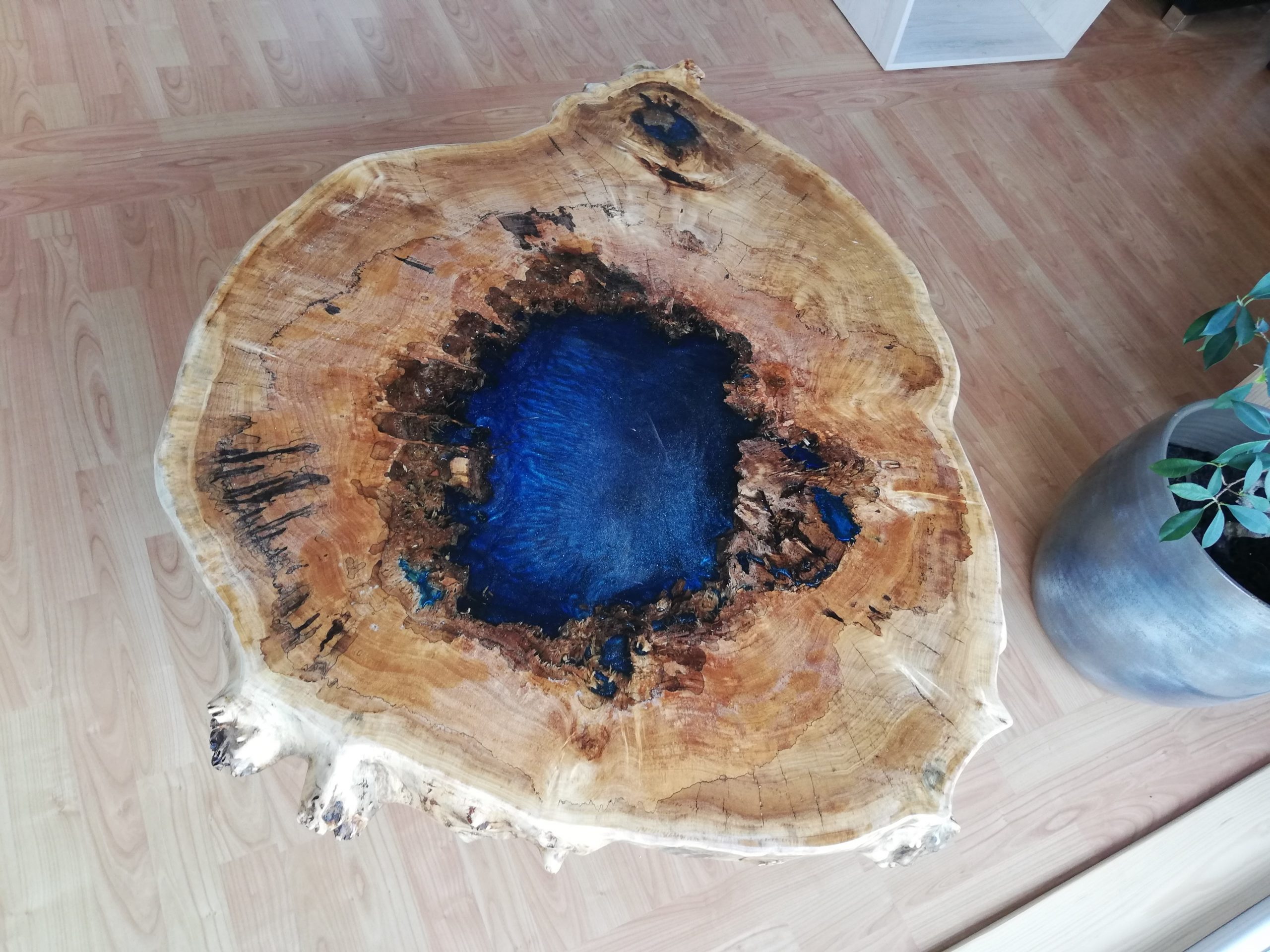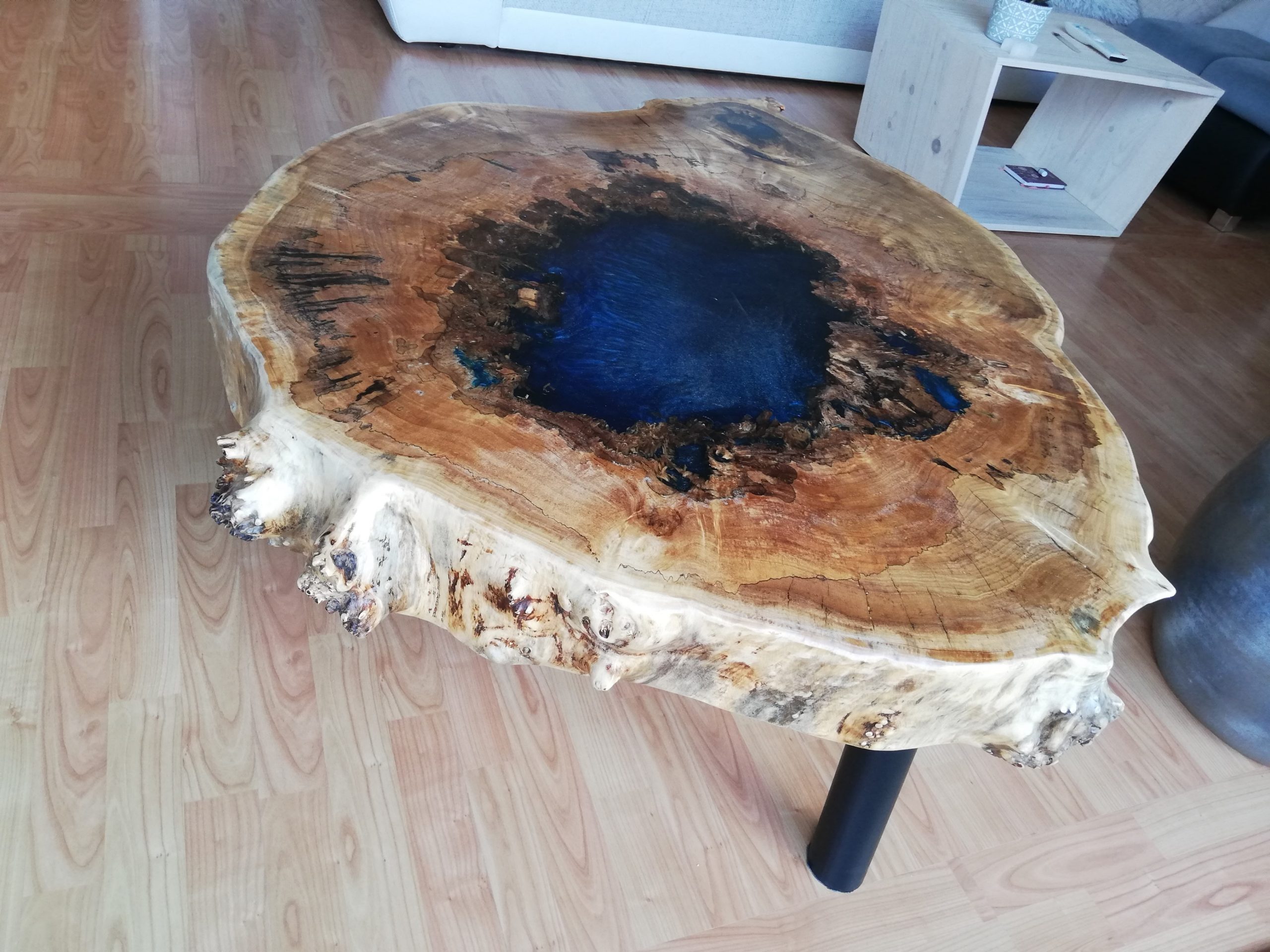 Kavna miza z modro epoksi smolo v sredini in črnim mat podstavkom iz železa.