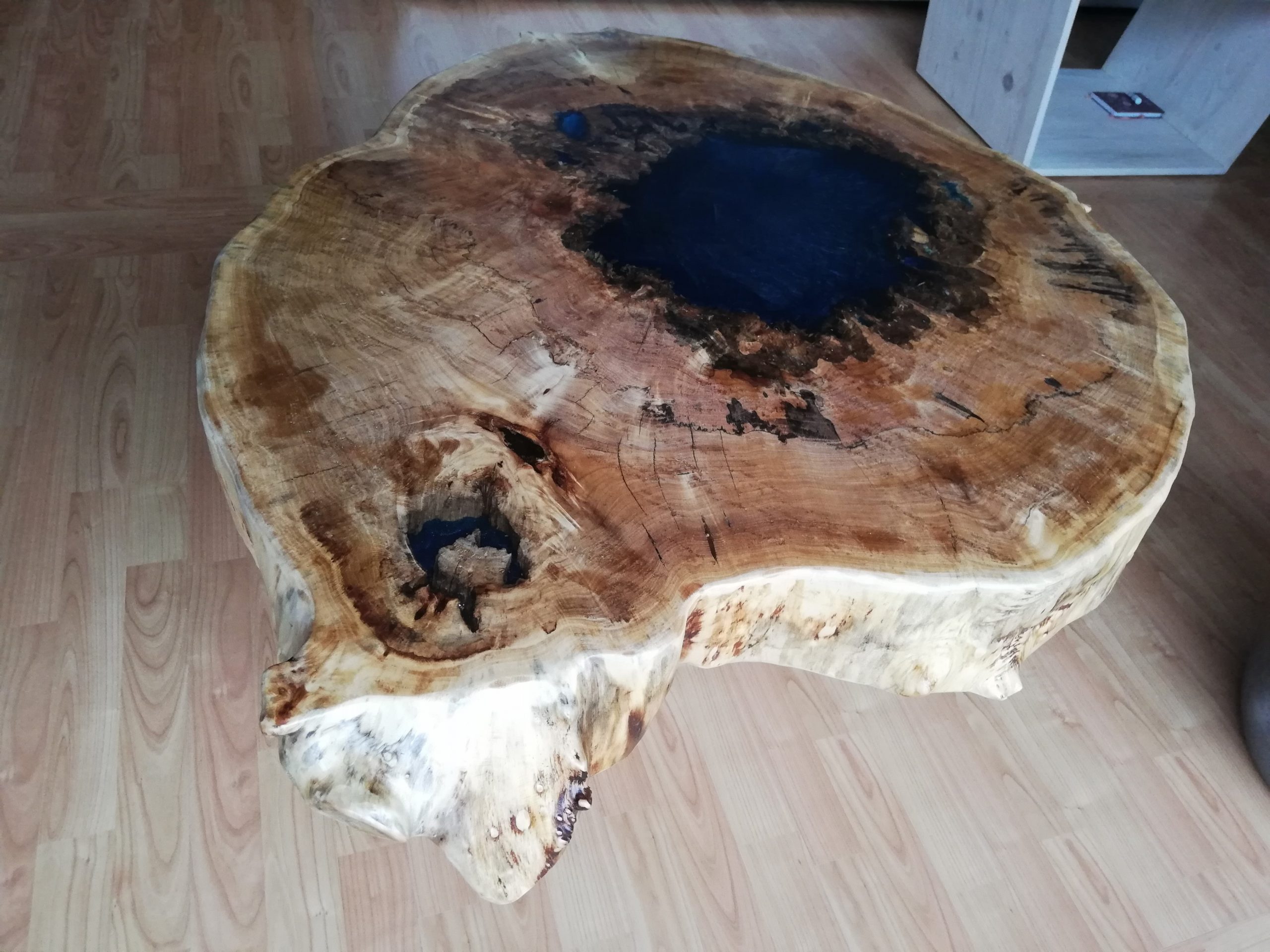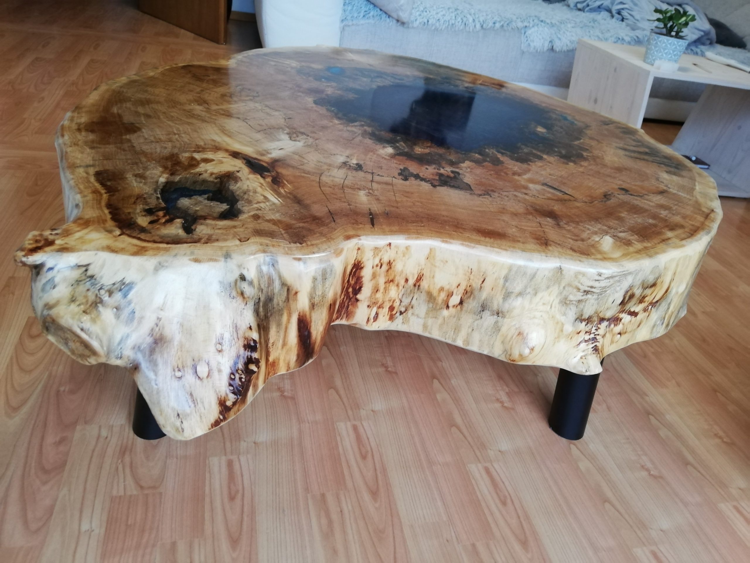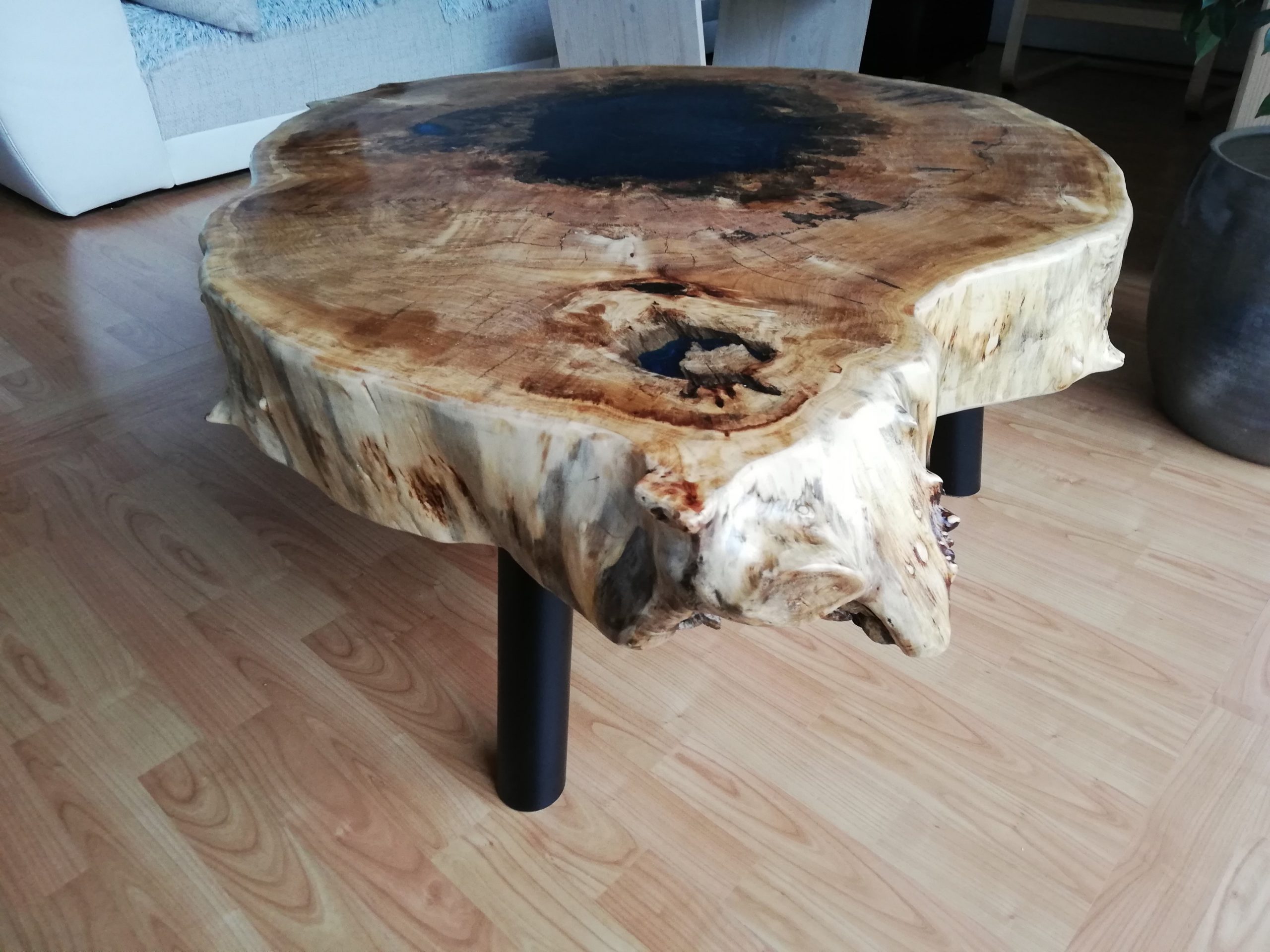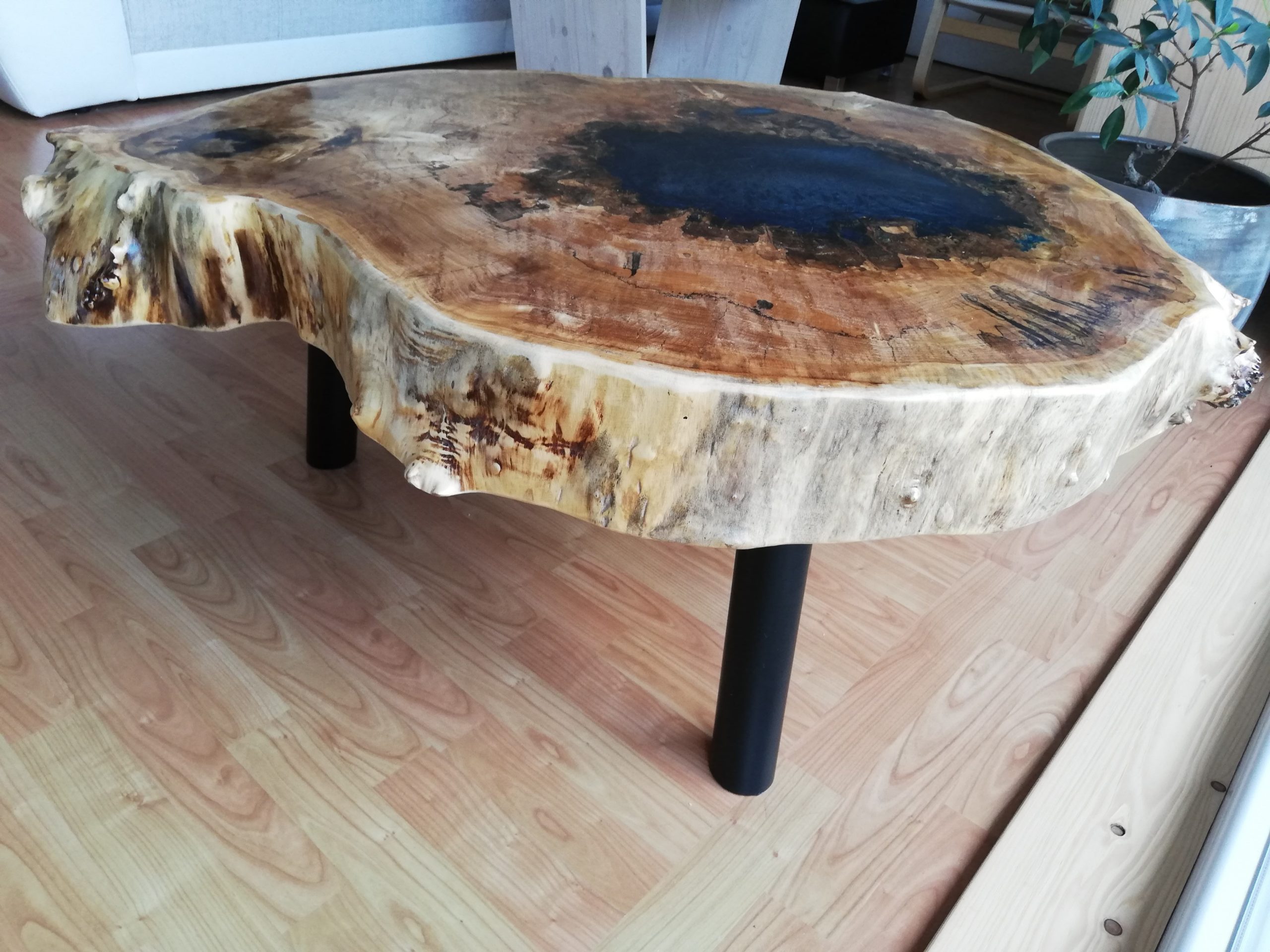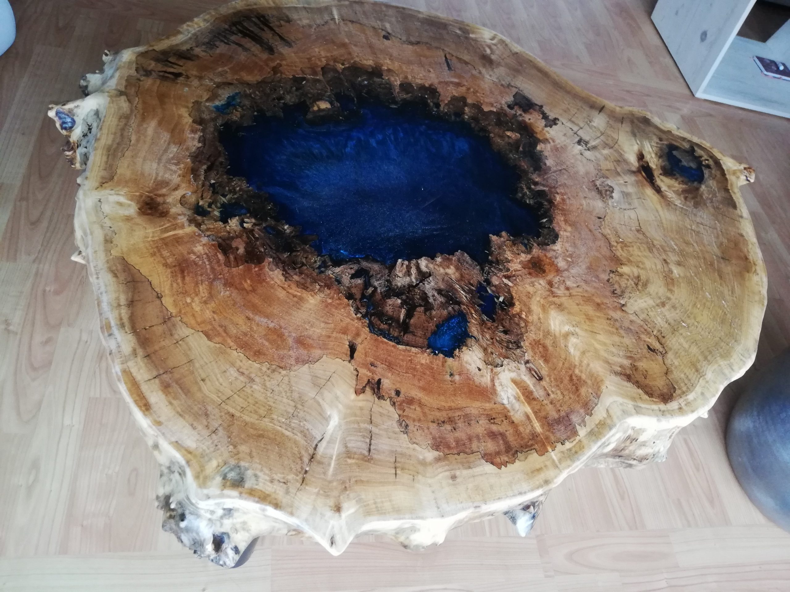 Kavna miza z modro epoksi smolo v sredini in črnim mat podstavkom iz železa.